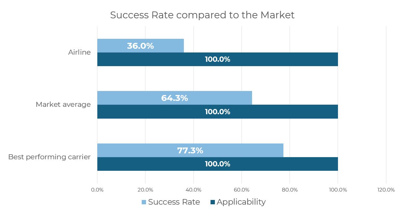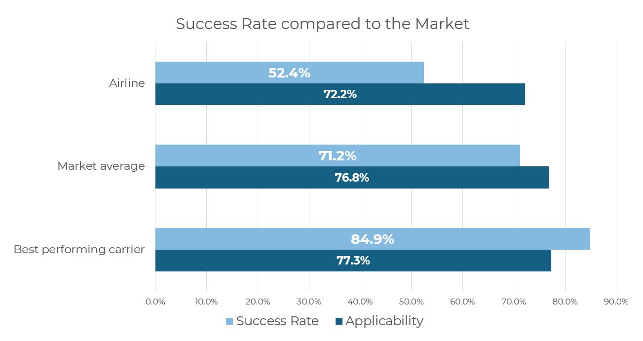 Here, applicability is 72.2% for our airline, versus 76.8% for the market average and 77.3% for the best performer meaning the applicability window is broadly similar across the peer group. Within that comparable window, the success rates deviated from the 100% applicability case; 52.4% for our airline versus 71.2% market average and 84.9% best-in-market.