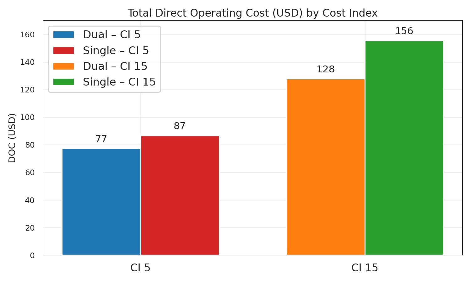 In this specific scenario, with CI = 5 kg /min, single-engine taxi can be about USD 10 higher than the dual-engine run; when CI rises to 15 kg /min, the difference grows to USD 28, as time-related costs dominate more strongly.