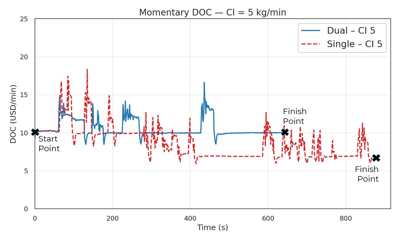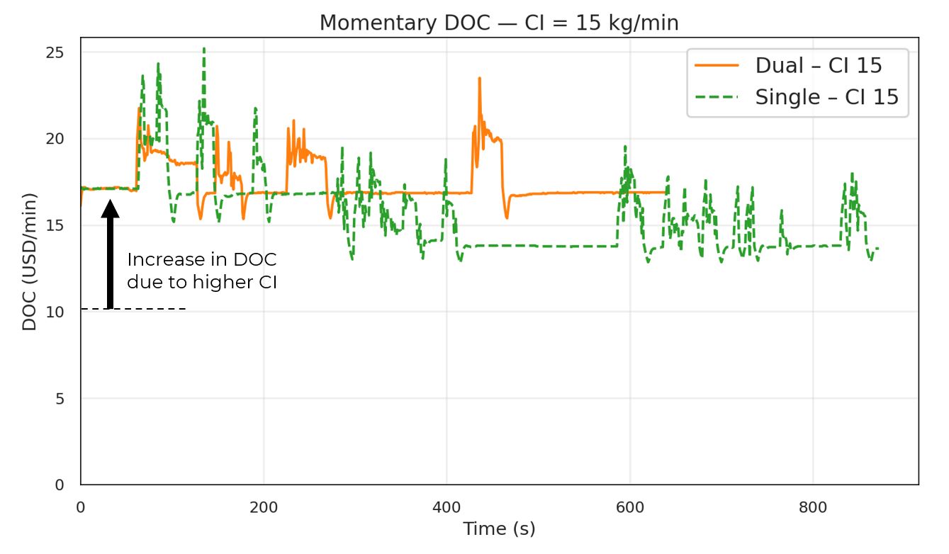 As an additional step to clearly show how the two Cost Index settings alter the economics, let’s overlay both CI profiles on a single total DOC chart.