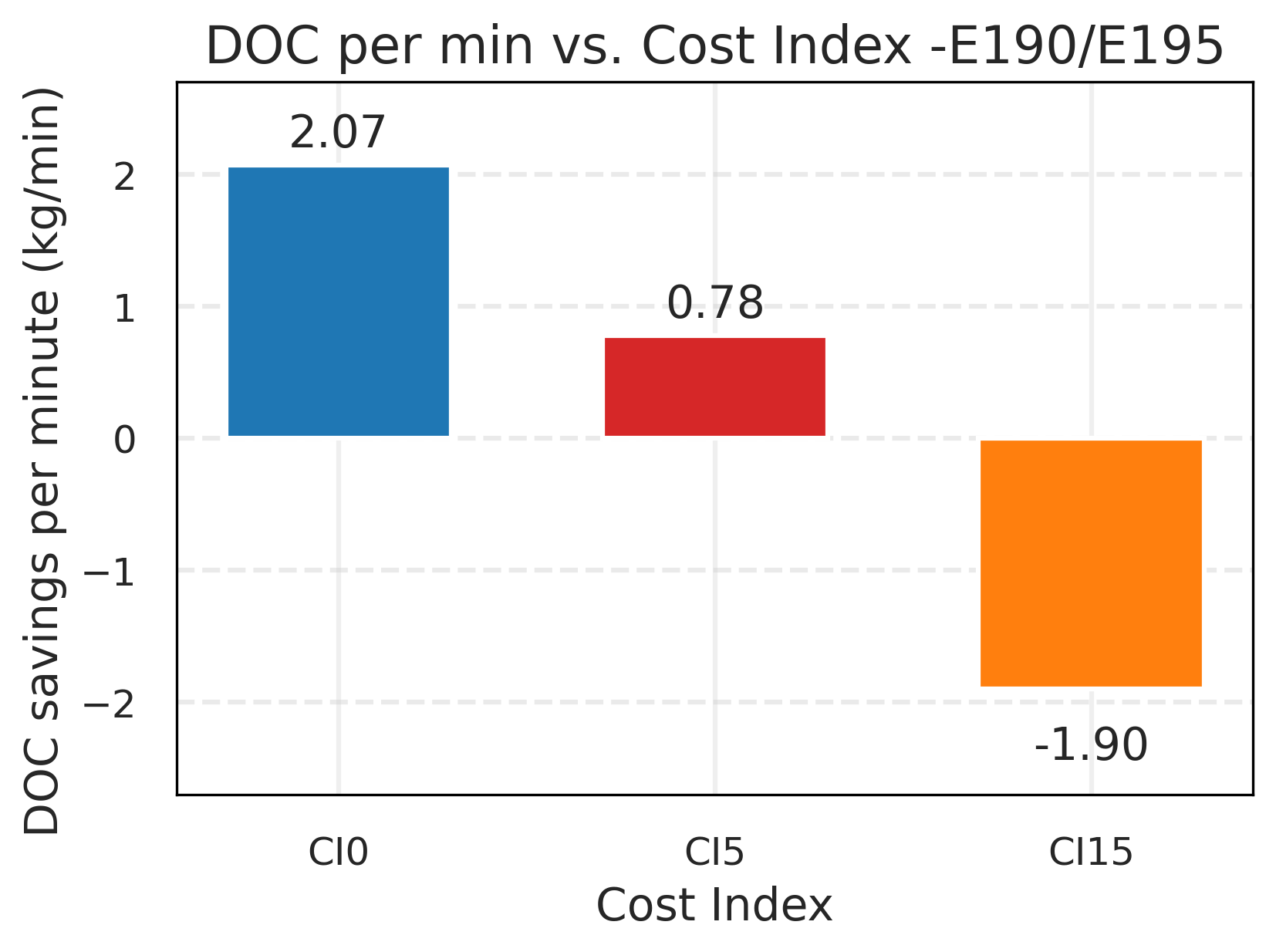 To test whether the pattern discussed above holds at scale, using the same dataset of >10 000 E190/E195 flights analyzed in our previous article, we recalculated the average DOC change per taxi minute over a wide Cost-Index range. As CI increases, the per-minute DOC advantage of SET compared to dual-engine taxi becomes smaller. Beyond a certain threshold, extra taxi time can reduce the benefit – which is why data-based use of SET, ensures capturing savings where they are strongest. This large-scale result confirms the above case study and highlights a cost effect that is often missed or maybe ignored by headline fuel-saving claims in the market.