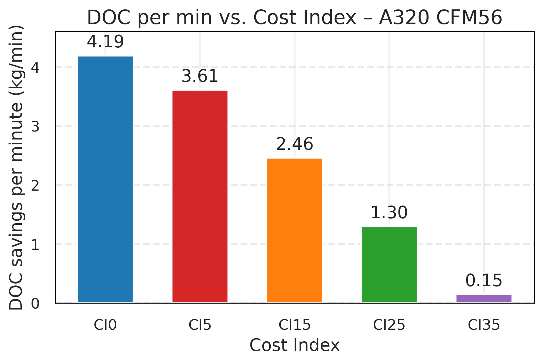 Remember that the E190 family is powered by two under-wing GE CF34-10E turbofans (≈ 18 500 lbf each), well below the A320 family CFM56 Engine’s 27 000–32 000 lbf thrust range. Lower thrust means slower acceleration during taxi, so the time component of DOC grows faster for the Embraer. This simply means the cost balance between single- and dual-engine taxi shift earlier, reinforcing the importance of SET tailored to each aircraft type. Because engine thrust is a key driver of taxi dynamics (as detailed in the previous article), our next step is to examine a comparable dataset of A320 flights with CFM56 engines and examine how DOC savings are distributed across the Cost-Index range for that higher-thrust fleet.